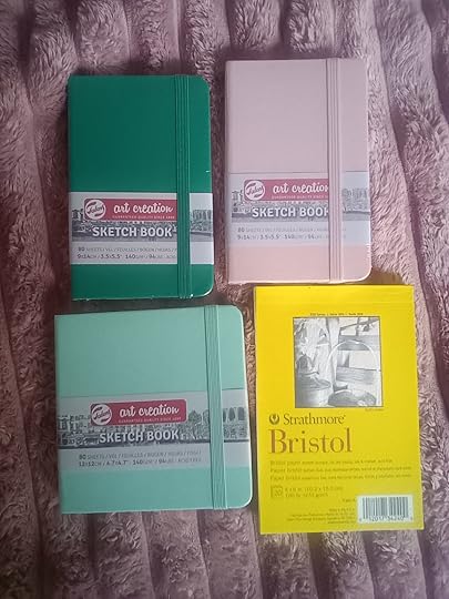 Pink and teal books are pocket size. The yellow pad is for alcohol markers. I have a few of those but haven’t done much with them. Since I am resolving to use things I have, that means alcohol markers as well. Disaster may well ensue. \