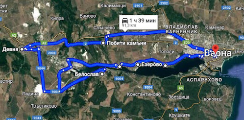 Джипиеса също сезабавляваше с нас. Зададох му първата си цел: Белослав пешеходно. Даде ми 19км. Целях да кръстосвам многолентовите варненски шосета възможно най-малко, чесъм дал обещание на жената, която обичам да сведа риска до минимум.