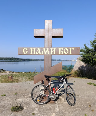 От ляво започна да синее Варненското езеро. Далече ми бешеза снимка, нещо щеше да го препречи, но когато стигнах на разклона към Казашко,езерото беше под носа ми. Засмях се, че то цялото ни Черноморие може да секазва в момента така. Пълно е с „казаци“, но въпреки тъмния ми хуморнастроението ми беше на върха, а синевата на езерото, както и православниякръст с надписа: „С нами Бог!“, пред който снимах колелото подсилваха негата.