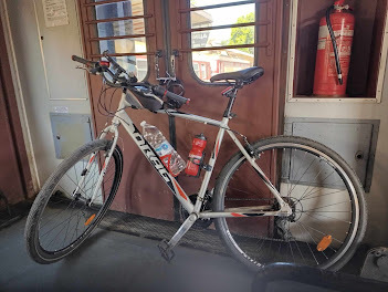 Този път композицията има само един вагон. От онези – салоните,с един широк ред пейки. Аз съм най-отзад. В преддверието където съм и вързалколелото. По-широко е отколкото във вагони с друг дизайн, имам и седалка.Пътувам повече от комфортно.