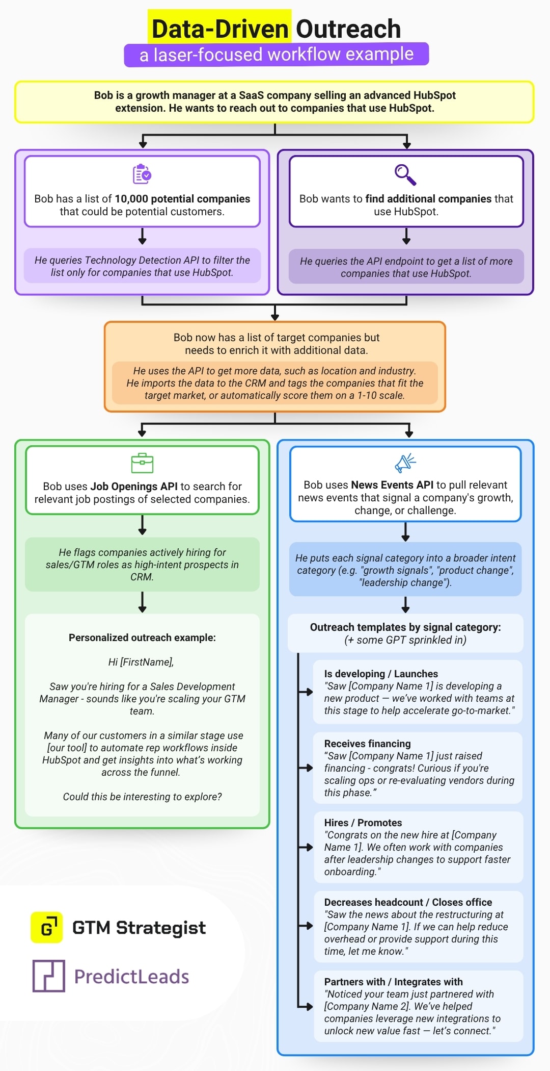 I wrote this guide in the hope of helping you navigate a battle-tested system for transitioning from "just reaching out" to "booking qualified demos." And I was not alone on this mission - PredictLeads pitched in with templates and triggers based on their 92 million companies database.