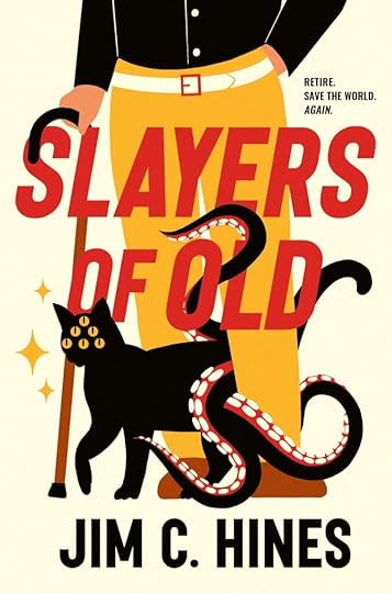 The cover of Slayers of Old by Jim C. Hines, which features the bottom half of a person using a cane, and a black cat that has been crossed with a shoggoth.