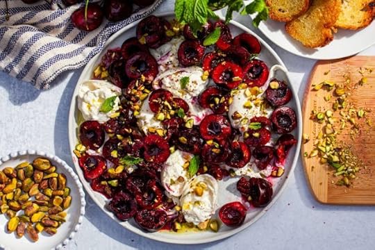 Last summer, a friend came to a barbecue and said, “We had soccer and then a birthday party and I had no time to make anything but I brought this” and started unloading items from a grocery bag. There were no clean cooking utensils so she and I proceeded to use our hands to break open balls of burrata and spread them on a plate, smash open cherries and pit them, sprinkling them over, crushed pistachios with the bottom of a pot, and finished the whole platter with olive oil, lots of sea salt, black pepper, and fresh mint we picked from sprigs. We lined the plate with rounds of storebought crostini, I snapped a picture and later when I shared it, dozens of you messaged me to demand a recipe or tutorial.