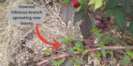 My single-branched hibiscus as of 7-2-25. Note that in the very front, it is also growing a brand-new branch.