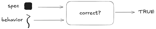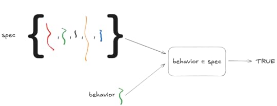 A spec as a set of behaviorsI depicted a spec in the diagram above as, literally, a black box. Let’s open that box. We can think of a specification simply as a set that contains all of the correct behaviors. Now, the “correct?” processor above is just a set membership check: all it does it check if behavior is an element of the set spec.
