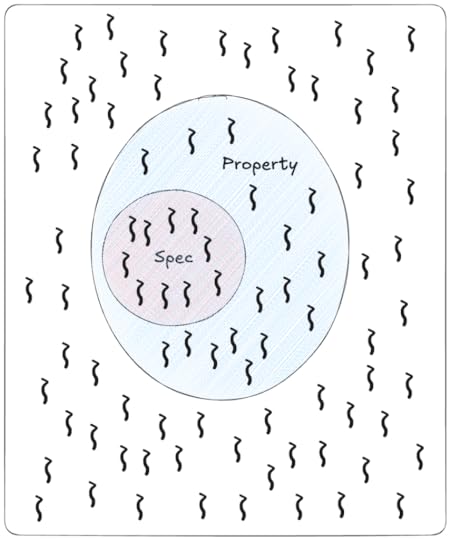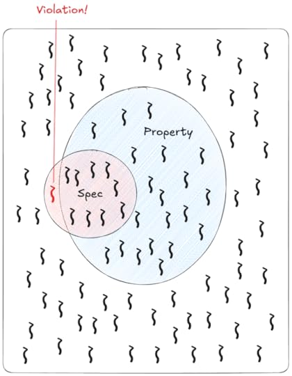 A spec that satisfies a property. When we check that that a spec satisfies a property, we’re checking that Spec is a subset of Property. We just don’t care about the behaviors that are in the Property set but not in the Spec set. What we care about are behaviors that are in Spec that are not in Property. That tells us that our specification can generate behaviors that do not possess the property that we care about.