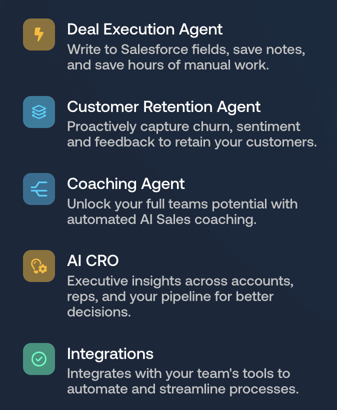 What it does: Writes to Salesforce fields, saves notes, and handles CRM hygiene automatically