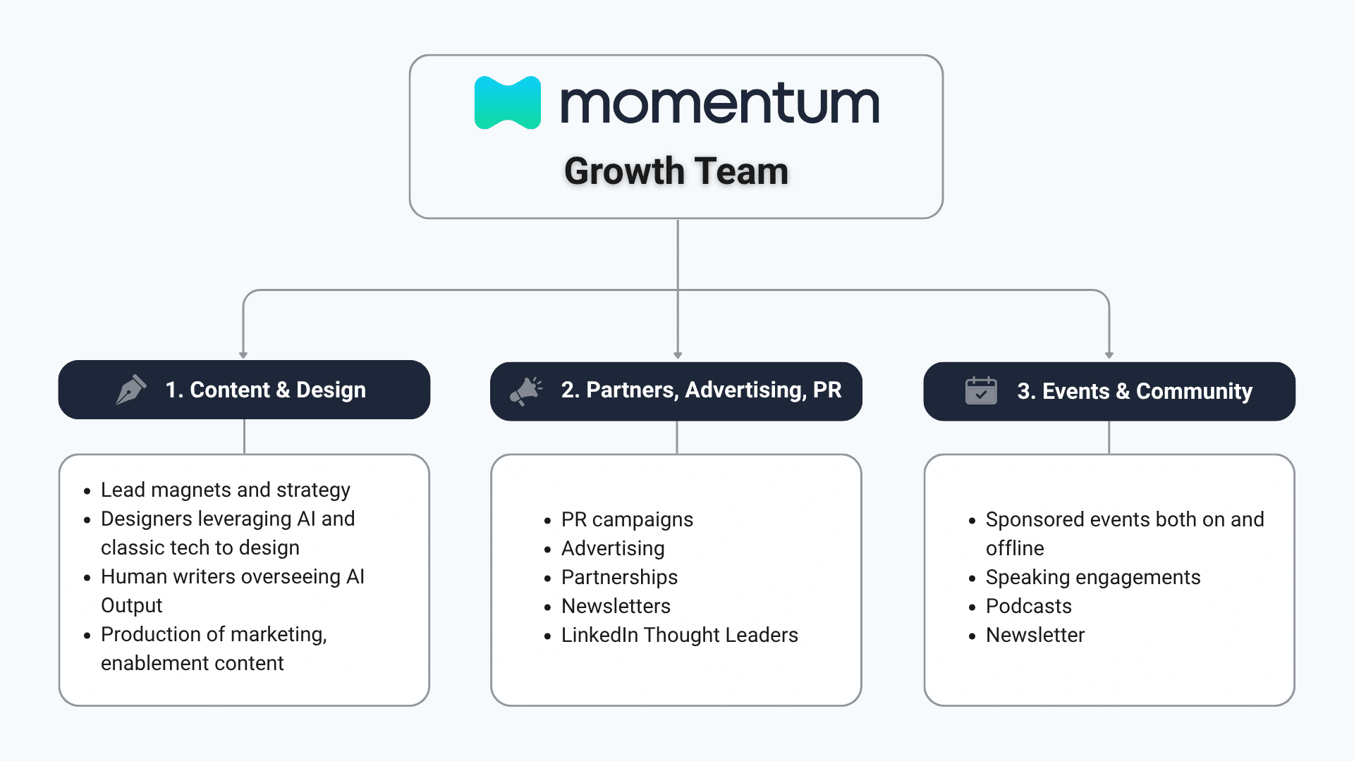 Momentum GTM Team Structure: Pods + Digital Workforce + Orchestration LayerSometimes when Jonathan and I talk, I imagine that he has 100 people working on his GTM team, given their consistent massive output. They have released 10+ in-depth white papers and reports, released the 200+ prompt library, redone the website, upgraded the brand, and pumped out over 100 pieces of marketing as well as enablement. But in reality, Momentum’s Growth team is structured around distributed, role-specialized pods: