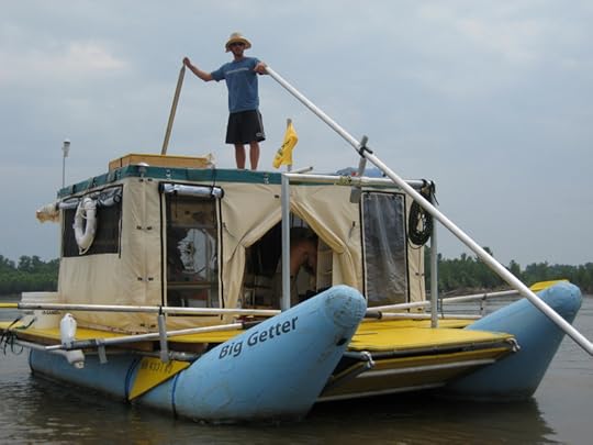 Mark Twain endowed us with more than literary masterpieces. He gave us a lasting river lexicon. America’s exclusive fraternity of riverboat pilots adopted a term for disciples of Twain who act on their fantasies of wild river adventure: Tom’n’Hucks. Because the boat McLarty built made a cartoonish first impression, it attracted skeptical curiosity from river veterans and barge pilots. That’s understandable. The barge pilots are professionals, guiding billions of tons of commerce between the red and green buoys that mark the river’s navigable channel. They view primitive rafts the way you view a skateboard on a highway.