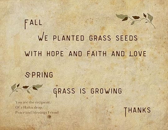 Each person shares a haiku they have written with each other. Usually, as you'll see below, we put them on cards or bookmarks which we can keep ourselves, and often make more to share with others. We either mail these to each other (how nice to get a haiku, hand-addressed, in the mail!) or send them electronically. We each then write a narrative response to each other's haiku, including our own, and then we get together to share our responses. The poet reads their own haiku, the others read their responses to it, and then the author reads their own narrative about it. In that way, we independently think about each haiku and then learn from each other.