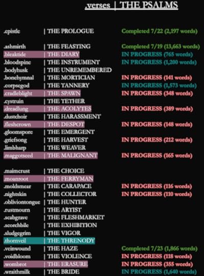 As you can see by the image below, strides are being made on .corpsegod. The intro and two stories are completely done and in need of editing with four more stories nearing completion quickly. That puts me at about a 25% completion right now, which I'm not mad about. And, I'm really loving how this book is coming together in all the ways. Not a lot of punches being pulled in this one.