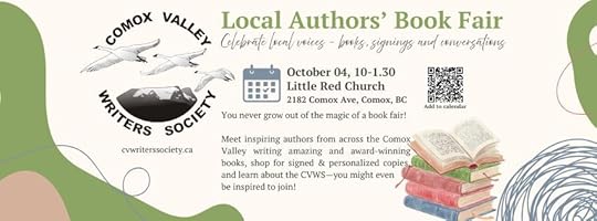 Upcoming Events & AppearancesOctober 4: Comox Valley Writers' Society Local Author Book Fair at the Little Red Church Community Arts Centre in Comox, BCOctober 24: "Read Local, Teach Local: Resources for Incorporating BC Books Into the Classroom" presentation & CWILL BC table at the BC Teacher-Librarians' Association Fall Conference at Gladstone Secondary School, Vancouver, BCNovember 22-23: Comox Valley Writers' Society Local Authors' Table at the Fanny Bay Christmas Market, FBCA Community Centre, Fanny Bay, BCDecember 20-21: Comox Valley Writers' Society Local Authors' Table at the Queneesh Holiday Market & Workshops at the Filber Centre, Courtenay, BC