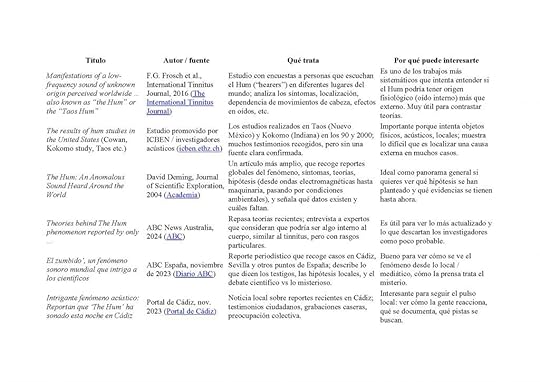 1. Manifestations of a low-frequency sound of unknown origin… (Frosch, 2016)2. The results of hum studies in the United States (Cowan, Taos & Kokomo)“Los encuestados hablan de un zumbido que se mueve dentro de sus cabezas, que se apaga al inclinar la cabeza, que vuelve tras un vuelo en avión como si hubiese esperado el momento de reaparecer. ¿Cómo puede ser esto obra de una simple máquina? Lo que aquí se describe no es un ruido externo, sino un contacto íntimo con otra frecuencia de la realidad, que algunos pocos perciben como elegidos o víctimas. El Hum se disfraza de tinnitus, pero su constancia lo delata: es un visitante, no una dolencia.”