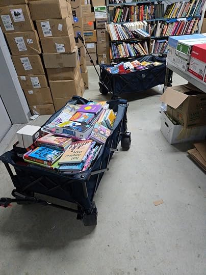 Yeah, my back still hurts after this one. As you probably know the library where I work is dealing with a mod situation. My department was displaced for a while, but now we have a temporary place to work from. The only trouble is, we had to move most of our materials ourselves…in wagons…up a hill. Have you ever dragged a wagon filled with books up a hill?