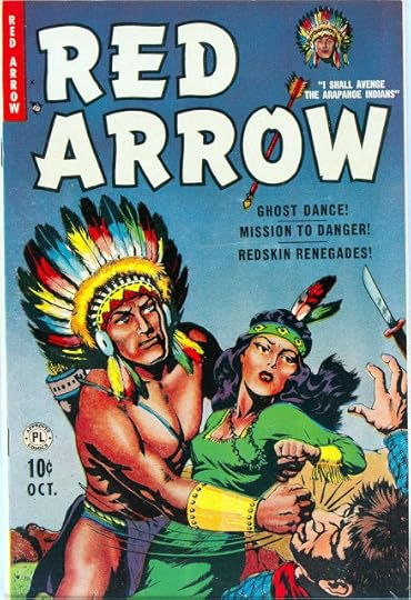 In 1951 P.L. Publishing released three issues of RED ARROW, devoted to the adventures of the war-bonneted main hero and his young sidekick Running Deer. The characters had no origin and were given no motive for riding around the West fighting evildoers. The stories were ordinary and the only art I liked was the cover of issue #3, shown below. The "Minnie-Hot-Cha" in the green dress may have actually shared the name of Hiawatha's bride, since in her one appearance she's named "Laughing Water."
