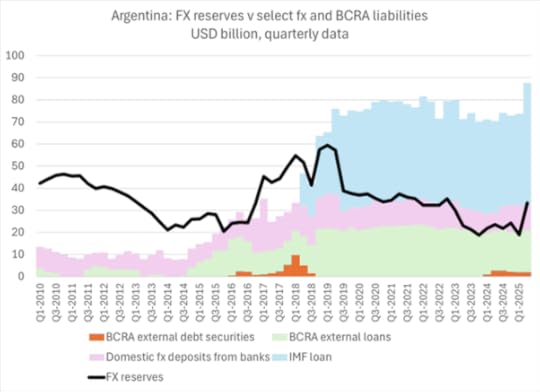 As soon as investors got hold of these FX dollars, they took them out of the country. In 2024, outbound investment totaled $3.3 bn (Argentines making portfolio investments abroad) and a $1.4 bn reduction in foreign portfolio investments into the country; so a total of $4.7bn outflow. In 2025 so far, another $2.6bn has left the country. This leakage of dollars is unsustainable.