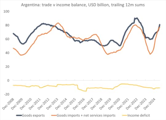 Milei may have balanced the government budget but the fiscal chainsaw did not deal with the continued weakness in the trade account. Under Milei, exports rose a little but imports also rose and income from exports flowed out. The monthly income deficit on the current account rose.