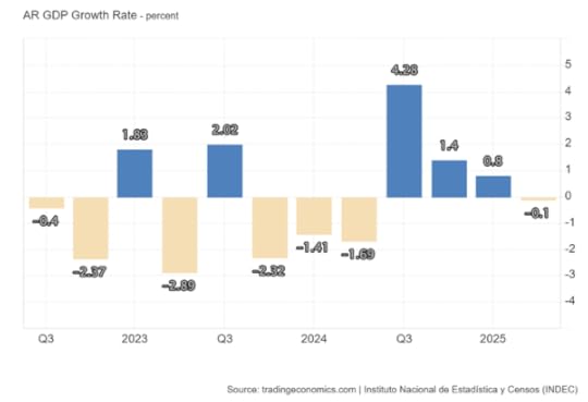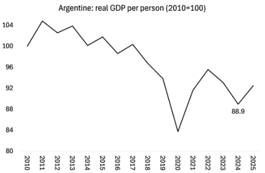 And that’s the long-term story of Argentine capitalism. The economy has basically stagnated since the end of Great Recession in 2088-9, particularly since the end of the global commodity prices boom in 2012. In the 13 years from 2012 to 2024, average real GDP growth was just 0.1%. Industrial output is falling and household consumption is stagnant, with retail sales falling. That’s hardly surprising when state salaries are down by 33.8% in real terms and Argentines are forced desperately to find work ‘informally’ as best they can.