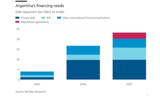 Beginning in September 2026, large FX debt service obligations to private bondholders are coming due. Argentina has $95bn of dollar- and euro-denominated debt, against net reserves of just $6bn, according to Barclays. And it has to make $44bn worth of debt repayments between now and the end of Milei’s term in 2027. So Milei can ill-afford to use scarce foreign exchange reserves to prop the peso.