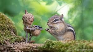 He builds little people out of acorns and sticks, then photographs them in the wild with real animals. I like the videos that share his process.