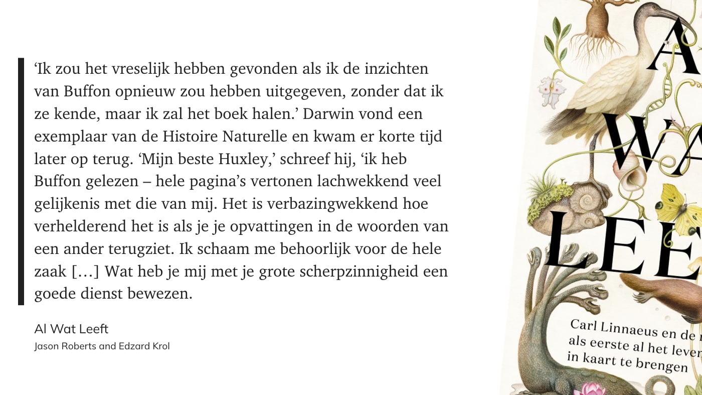 As lezer kwam ik al snel in de Buffon-fanclub. Waar Linnaeus als een behoorlijk rechtlijnige en religieus man overkomt, is Buffon ruimdenkend en gaat hij meer uit van waarneming en ervaring. Buffon geloofde niet dat de natuur zo eenvoudig te categoriseren was als Linnaeus beweerde, iets waar hij zijn gelijk in zou krijgen. Buffon beschreef (al in de 18e eeuw) hoe de mens de aarde kon verwoesten en dat dit geen onuitputtelijke bron was. Zijn theorie over overdraagbare eigenschappen zou je volgens Roberts kunnen zien als een voorloper van de ontdekking van DNA.