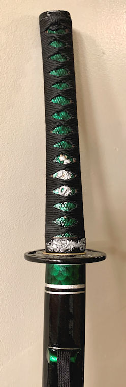 The ito mostly hid the fact that the scales are going the wrong way (oopsy!), and I was really happy with how the brushed-aluminum menuki looked against the black and green.