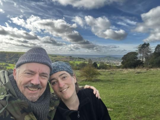 This is a recent photo of Keith and myself on Rodborough common – a hilltop near our home. It was the first time I’d tried walking up there since the vision loss. I can’t make much sense of the ground – I see little detail and have no depth perception. On the flat I manage pretty well, but on uneven walks I need my stick, Keith’s arm and a lot of verbal guidance. He’s very good at talking the terrain as we go, translating the shape of the hill into useful information. Walking like this isn’t easy, but it is possible.