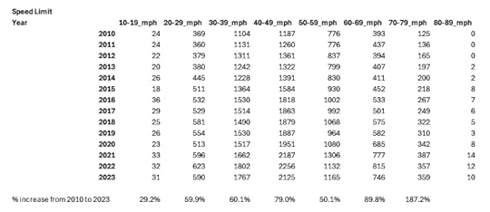 Percentage-wise, the biggest increase is actually at the top end of the scale, particularly with 70-79 mph speed limits (where deaths have nearly tripled). This doesn’t seem consistent with “minor increases in speeding” as a cause of increased deaths.