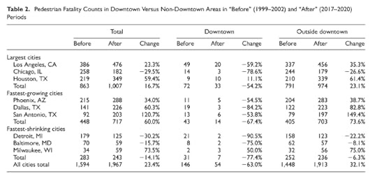 The previous article looked at the location of pedestrian deaths by state, and by type of road, but didn’t go more granular than that. I was pointed to a 2023 study that looked at changes in where pedestrian deaths are occuring. It notes that pedestrian deaths seem to have actually declined in downtowns, even as they’ve increased in suburban areas: