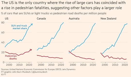 John Burn-Murdoch of the Financial Times wrote a piece on US pedestrian deaths in 2024, which threw some additional cold water on the big SUV hypothesis. A variety of countries have seen huge increases in the number of SUVs sold, but only the US has seen an uptick in pedestrian deaths.