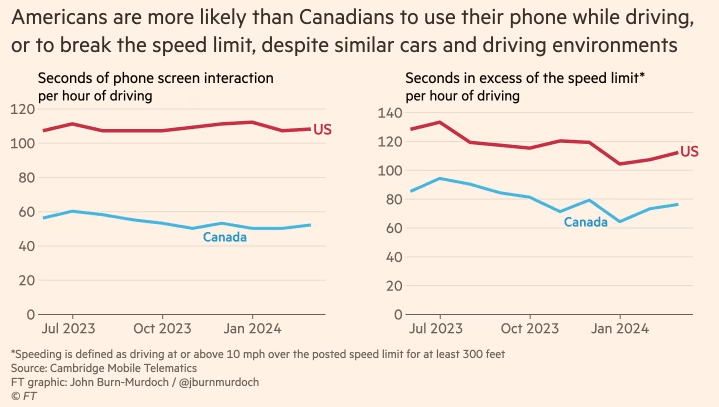 Burn-Murdoch points to some evidence that it might be phone use, showing that US drivers seem to spend much more time on their phones than Canadian drivers. But this data (which only covers a year) isn’t enough to show whether there’s been a change in US phone use over time.