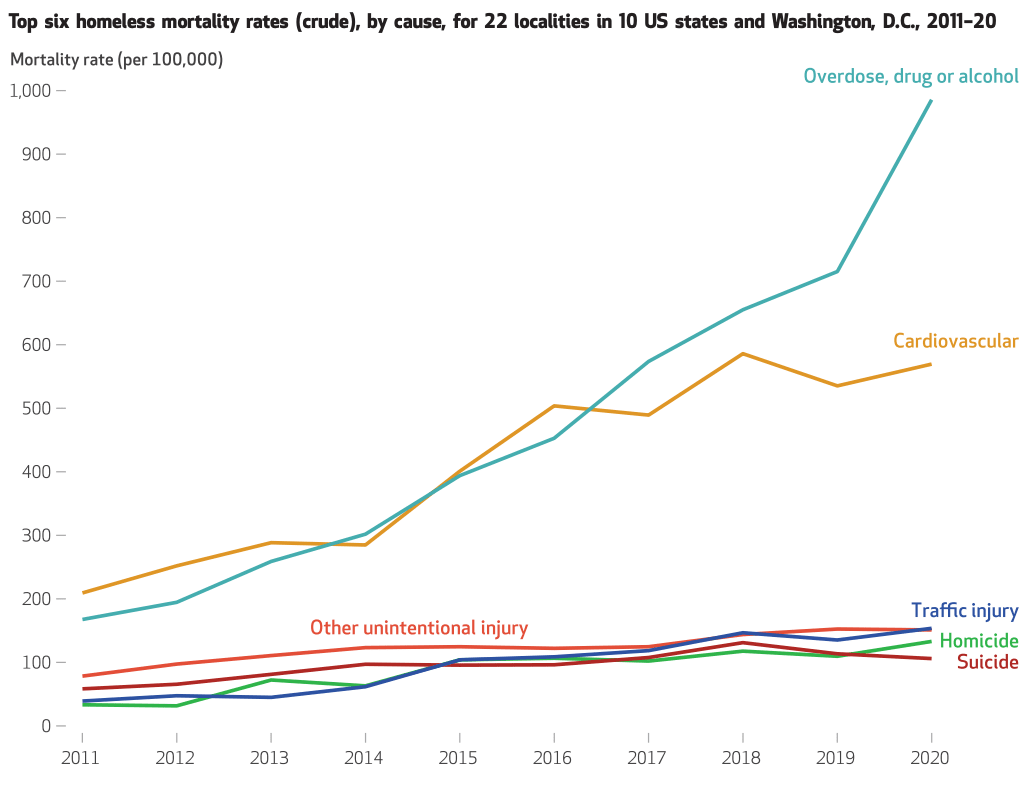 It’s also the case that the rate of death from traffic accidents among the homeless has dramatically risen in recent years. A study on the causes of death in the homeless across several different locations found that traffic fatalities had increased substantially from 2011 to 2020 (eyeballing the graph, it seems to have roughly quadrupled, from around 40 per 100,000 in 2011 to 150 per 100,000 in 2020).