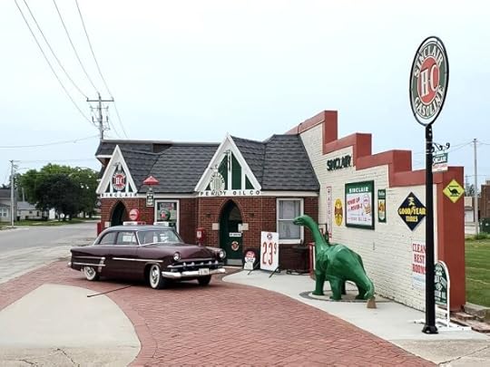 A few years back, I was invited to give a talk, set up by someone else, for a Corvette club at the Dallas County Freedom Rock®, about the Wilson brothers whose service is remembered there. This memorial had dedicated October 19, 2019. Leora’s Letters: The Story of Love and Loss for an Iowa Family During World War II was published a month later..The time had never been confirmed and I didn’t know who to contact. My Favorite Guy asked if I wanted to drive to Minburn anyway. Sure, and maybe we could motor on up the road from Minburn to Perry to see Joe Unger‘s iconic Sinclair gas station and get a picture with Guy’s Corvette in front it..There was no one around at the Freedom Rock®, except cyclists at the Nineteen14 restored depot, taking a break at the bar and grill from riding the Raccoon River Valley Bike Trail.The restored depot, now Nineteen 14 restaurant, is at the left. The yellow signs are along the bike trail. The men on the Freedom Rock are Donald, Delbert, Dale, Danny, and Junior Wilson–Grandma Leora’s five sons who served. Only two came home.It was about 10:00, so we waited a little while, but gave up and headed for Perry and the old Sinclair station. Folks like to park their classic cars in front for photos. The owner dresses up the big Dino for holidays.We began meeting a string of Corvettes, all waving at us, noticing Guy’s red C5. So we turned around and I got to tell the Wilson WWII story for them after all. The Freedom Rock at Minburn is only a couple of miles from where the Wilson family were tenant farmers before and during the war–until Clabe Wilson could no longer handle the farm with his sons all serving in the US Navy and US Army Air Force.Guy’s Corvette that he found in pristine condition in Minneapolis and owned for a few years. He was a little disappointed that I’d rather ride in the pickup!While I was finishing my talk, another group of collectible cars rolled in. They also wanted to hear the story of the Wilson brothers, so I was able tell it twice. How amazing and humbling this day was. And it wasn’t done..The Corvette group had invited us to have lunch with them at Brickyard Burgers & Brews in the county seat of Adel, so we did. What a blessed day!.We never did get a photo of the Corvette at the beautiful old gas station, but we took a selfie there when we stayed at the Hotel Pattee in Perry for our fifty-fifth wedding anniversary in 2021.Our one (and only) selfie with the Dino at the restored Sinclair station in Perry, Iowa. May 29, 2021.—–
