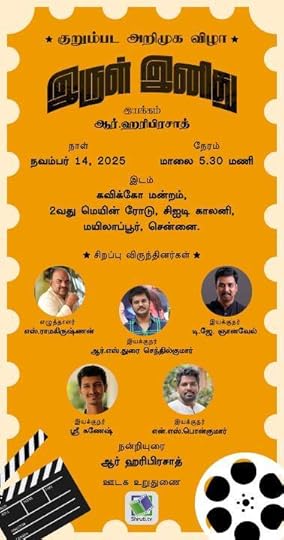 எனது மகன் ஹரிபிரசாத் இயக்கியுள்ள இருள் இனிது குறும்படத்தின் திரையிடல் மற்றும் அறிமுகவிழா நவம்பர் 14 வெள்ளிக்கிழமை மாலை சென்னை கவிக்கோ மன்றத்தில் நடைபெறுகிறது.