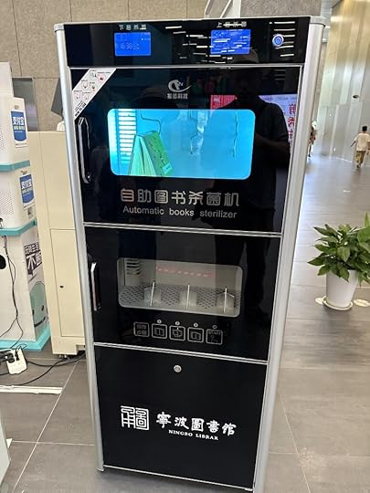 In contrast to the Ningbo University Zone Library, the Ningbo Library requires identification upon entry, though a simple cellphone swipe of a QR code gets one in (everyone who went through Covid in China is used to this). In the spacious lobby, which contains a circular information desk and above it, a large LED sign with a 3D-view of the building and numerous statistics about the library, I noticed a curious machine for sterilizing books, recalling Fan Qin’s book-airing and deworming routines. Sterilization of borrowed or returned books is not required and seems to function as a psychological palliative, though it might have been a lifesaver during Covid.