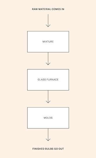 We can draw this series of steps using a process flow diagram, a visual representation of how a process unfolds. See Figure 2 for an example of what the bulb blank process might look like. Making bulb blanks is an example of what we’ll call a production process—a series of steps through which input materials are transformed incrementally into a finished product. Each step in the process induces some change in the input material. The changed material is then passed on to the next step, which makes another change, and so on, until the finished product comes out the other side. In the bulb blank process, sand, lead, and other chemicals are the inputs. These are gradually transformed by heat, chemical reactions, and physical manipulation until a finished bulb blank emerges at the other end.