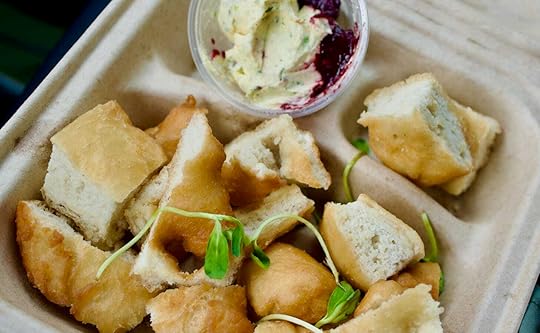 Maybe one day I’ll write about the experience—the food was phenomenal. I had Pork Belly Succotash. When I departed the Floyd home the following day, I carried leftovers for my journey. Here you see fry bread with herb butter and wojapi, or berry sauce, garnished with sunflower sprouts.