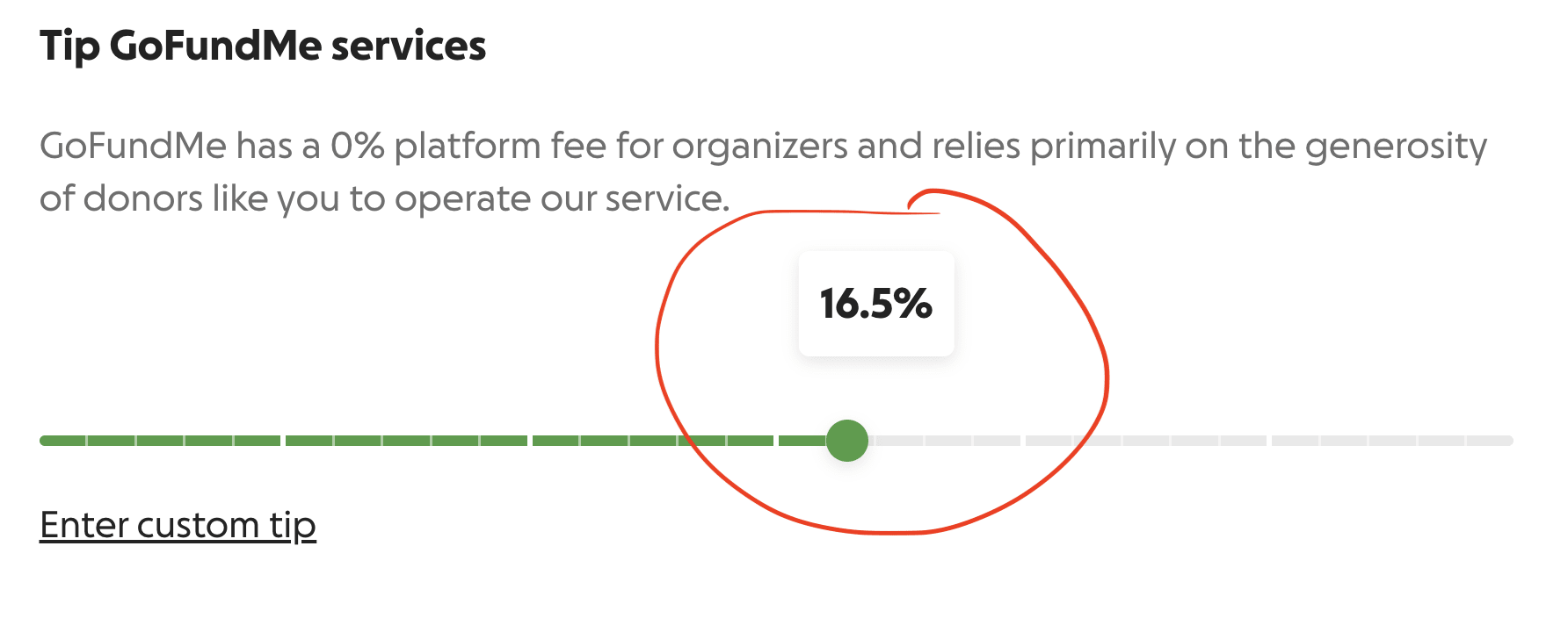 Amateur tip: GoFundMe is a for-profit company that automatically sets its tip at 16.5%. That tip is optional, and you can reduce, or increase it, by moving the slider.