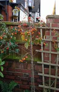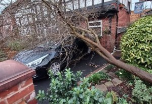 By sheer luck the cherry had come down between the garden wall and our brick porch and come to rest across our car! There was nothing we could do between us with the gale still blowing and torrential rain lashing down.