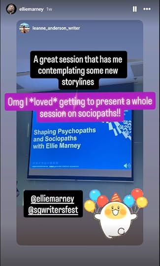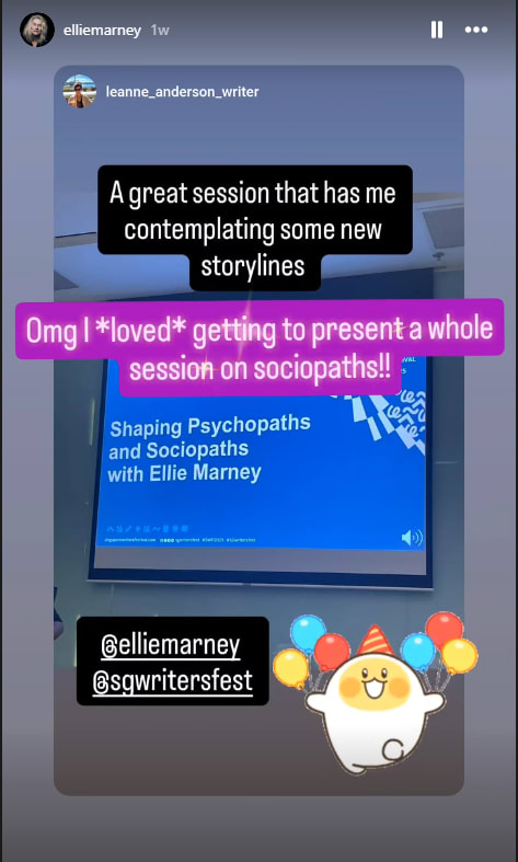 Okay, so while I was at Singapore Writers Festival, I gave a masterclass seminar called “Shaping Psychopaths and Sociopaths” which was basically just my theories on how to write serial killers and sociopaths (which, I must emphasize, are sometimes different things), all rolled up in a disclaimer that I am not a psychologist/psychiatric professional, nor do I have any experience as a criminal lawyer (I mean, my dad was a prison guard, and I’ve taught creative writing in a women’s prison a couple of times, but that’s as close as I’ve come to direct contact with offenders. If you want someone who’s dug deeper into this, talk to Candice Fox, she has some cool stories).