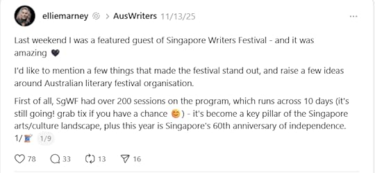 Two other things I took note of during Singapore Writers Festival: Firstly, the festival theme was “The Shape of Things to Come” which meant it was stacked with SFF/spec fic writers – an engagement with genre fiction that provided way more audience connection than I’ve experienced with literary festivals at home. Secondly, there was a focus on young people – as attendees, but also as participants – that was really energising. They had teenagers making Reels and doing author interviews on Tiktok as part of festival promotion, as well as an attention to youth interests in the programming, plus teenaged moderators who were trained to lead some of the panels. It made the festival feel really vital and exciting!