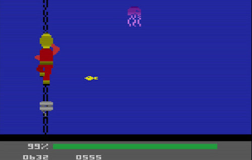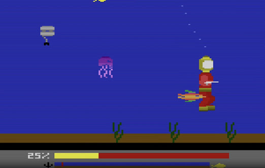 Upon reaching the bottom, the diver explores the seafloor in search of Poseidon’s Gate, the grotto where the stranded mini-sub islocated. Movement here involves short, floaty hops reminiscent of lunargravity, requiring careful timing. The third phase introduces the Shark Grotto,where the diver must fend off waves of sharks with a harpoon to free themini-sub. After the rescue, the player retraces their path toward the ship’sanchorage, conserving air and avoiding familiar threats, before reaching the finalphase—climbing the ship’s anchor chain to the surface. Success depends onbalancing ascent speed with limited oxygen, all while evading additionalunderwater dangers. Throughout the journey, air management remains central togameplay, with emergency air tanks available to replenish supply. Running outof air before reaching safety results in failure.