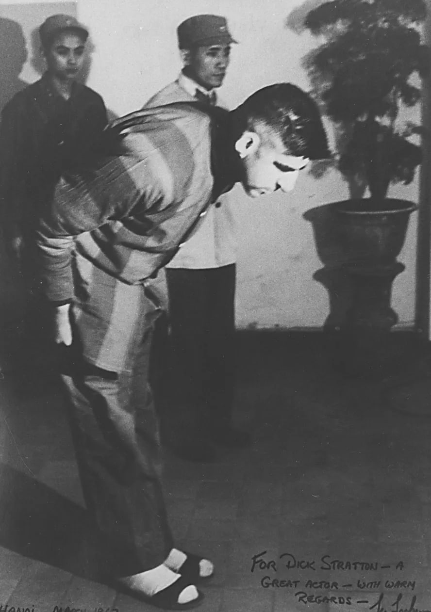 Another Navy officer, Lieutenant Commander Richard Stratton, was brought before a carefully staged press conference. Wearing prison garb, he entered and then performed a series of deep, formal bows—from the waist, rigid and repeated — turning toward different directions as if submitting to his captors and camera crews. An American journalist present described him as “looking like a puppet” whose “eyes were empty”.