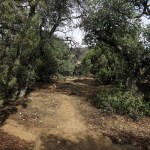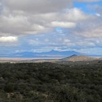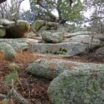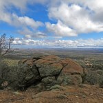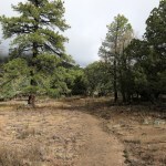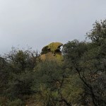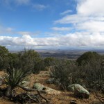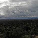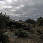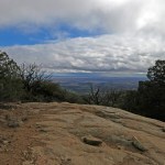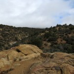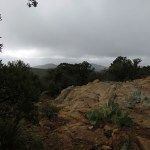 I had some sun starting up the trail, but the dark clouds soon closed over and brought drizzle. The trail starts in a sandy basin then winds its way through granite boulders up a seemingly endless series of mazelike ridges, finally reaching the crest of this low range, where ponderosa pines rise sporadically above oaks and junipers. When I’m in shape, this hike is too short and monotonous for me, but I’ve done it several times, twice in snow up to a foot deep.