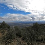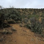 The exposed nature of the trail through the foothills is what attracted me today, but it soon exposed me to wind, and even after the rain stopped, despite my long-sleeved shirt, sweater, and storm shell, my arms got chilled. I’d only gone a mile or so and hated to give up, so I pulled out my rain poncho for another layer of wind resistance. It whipped around in the wind and wasn’t very efficient, but it just barely kept my arms from getting colder.