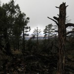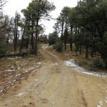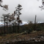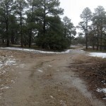 I found much less snow than I expected. I didn’t want to continue up the road to the towers, the peak, and the spectacular view, because it’s totally exposed up there and I’d just get more chilled. A plateau less than a hundred feet below the peak contains the foundations of an old scout camp in parklike ponderosa forest – a nice picnic spot in good weather.