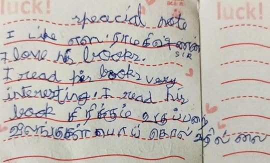 மூன்றாம் வகுப்பு படிக்கும் தனது மகள் பிரகதியாழினி அவளுடைய சிறு குறிப்பேட்டில் பின்வருமாறு குறித்து வைத்திருந்தாள் என அவளது தந்தை ரவி அனுப்பி வைத்திருந்தார். பள்ளி மாணவர்கள் என்னை விருப்பத்துடன் வாசிக்கிறார்கள் என்பது மிகவும் மகிழ்ச்சி அளிக்கிறது. பிரகதியாழினிக்கு எனது மனம் நிறைந்த வாழ்த்துகள். அவர் தமிழில் எழுதிட பெற்றோர்கள் உதவிட வேண்டும்.