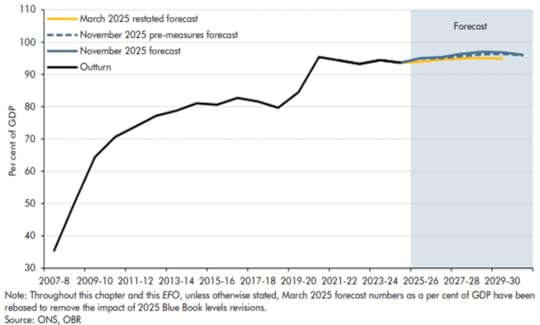 And the likelihood of meeting even the government’s fiscal targets are low.  As the OBR says: “the economic outlook depends on uncertain judgements on the paths for productivity, inactivity, and net migration. The fiscal forecast also remains highly sensitive to movements in interest rates and inflation given the level of debt.”  The OBR puts fiscal success at just 59%.