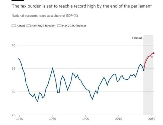 So what has Reeves done?  In order to ‘fill the fiscal hole’ to keep government debt from rising, she has not raised taxes on the rich; she has not raised the tax rate for the richest earners; she has not introduced a wealth tax on the super-rich.  Instead, she has raised a ‘stealth tax’ on average earners which she admits will “hurt working people. I won’t pretend otherwise.”  So the tax burden as a share of national GDP will reach an all-time high by the end of the Labour government’s term of office in 2029 (if it lasts that long).