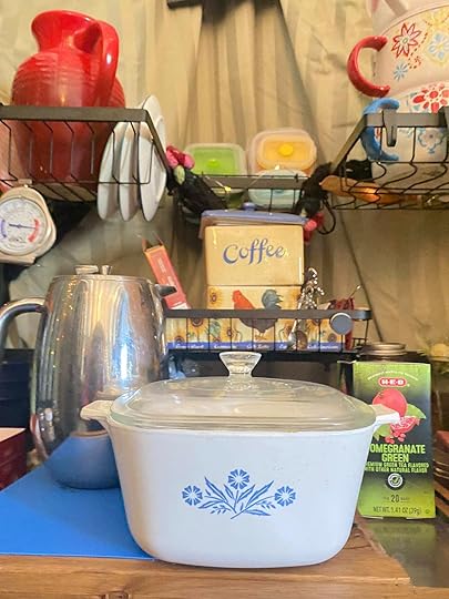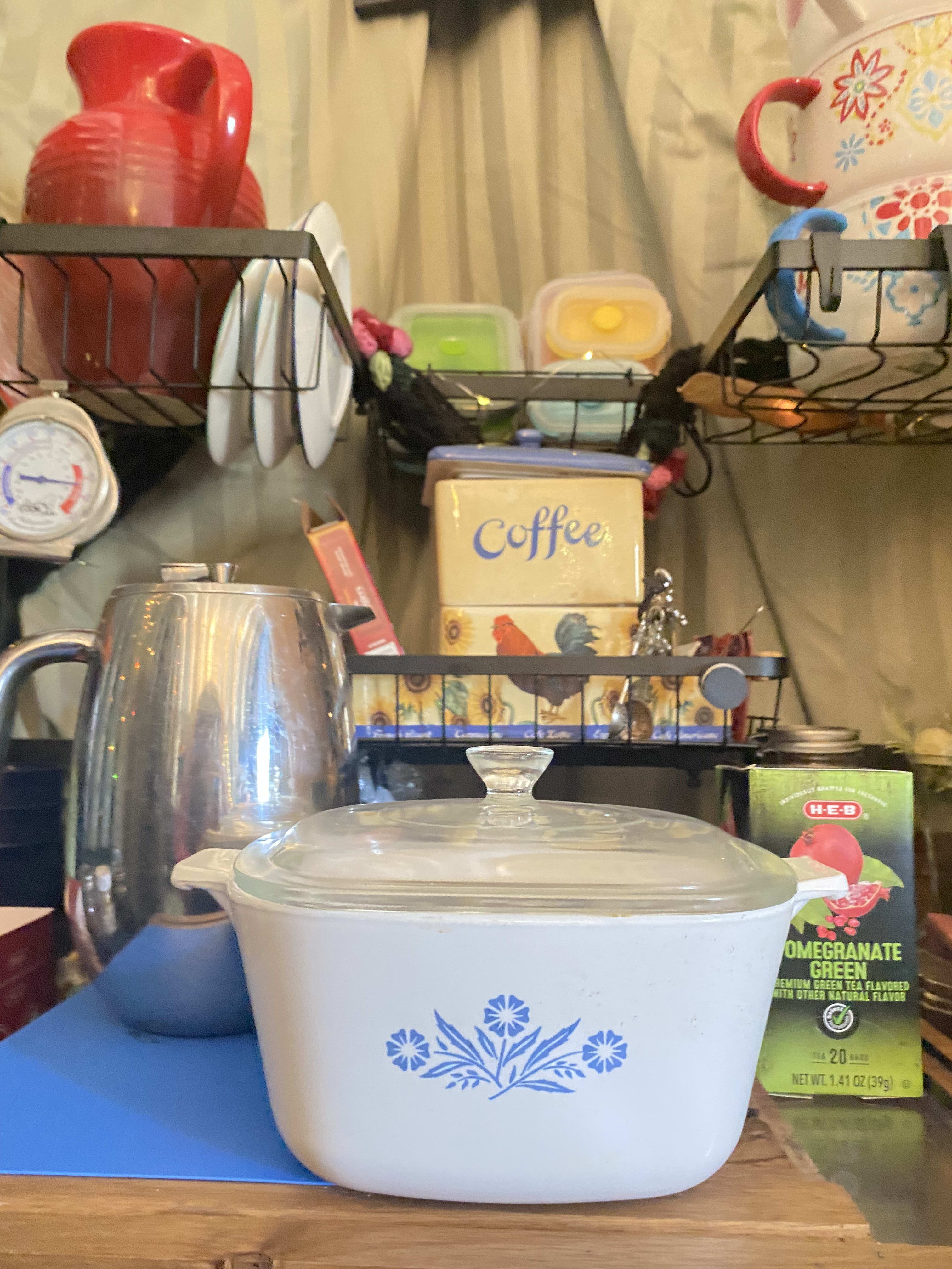 This CorningWare Dish of the Sacred Stuffing is older than all y’allIt’s literally a person missing from the table; not in a chair but actually ON the table, a place where a dish of heart and heat resided, now empty. That shallow CorningWare dish with the blue flourish is bereft of what made it truly beautiful to me, not just the food it held but the hands that made it -